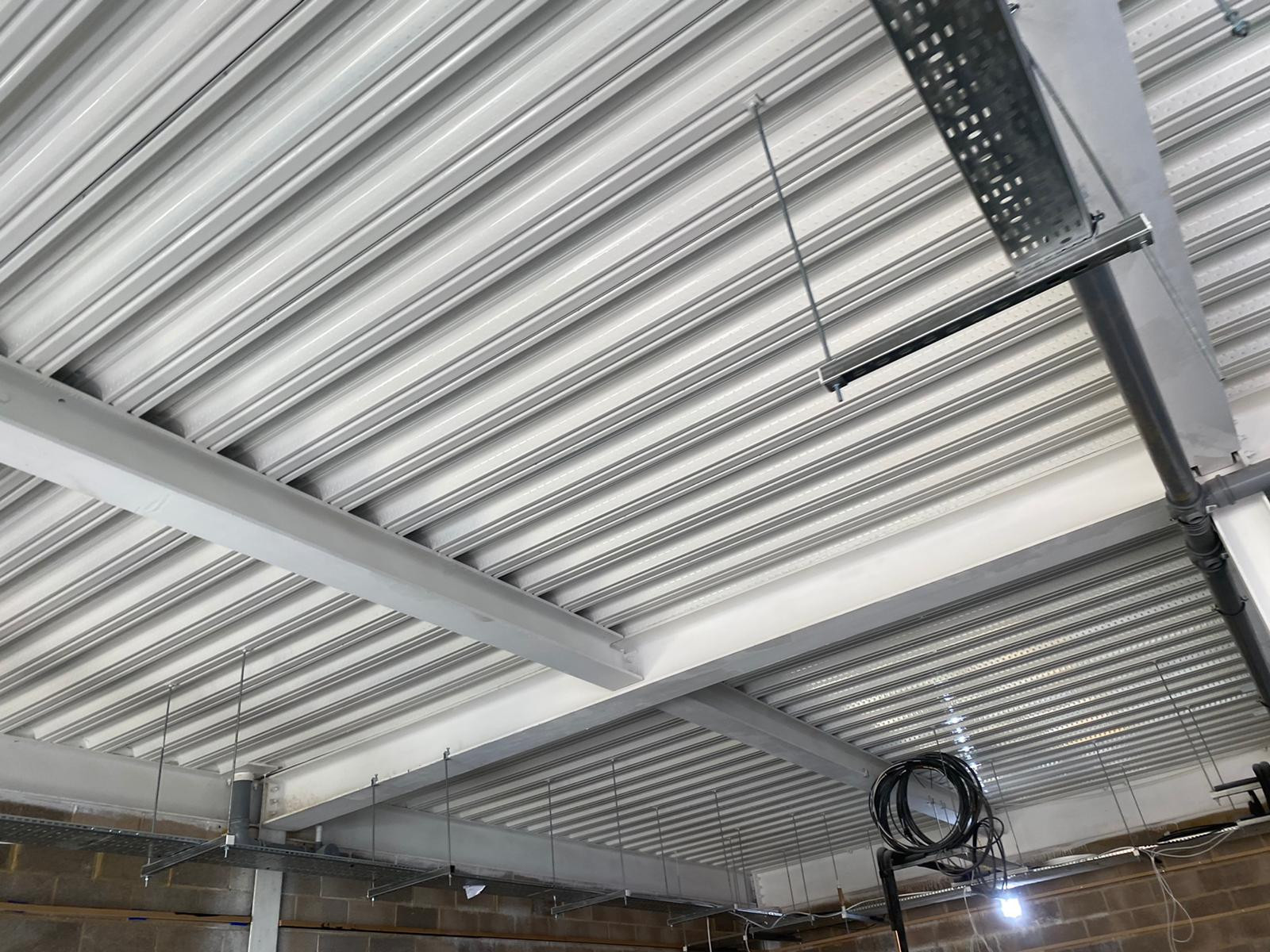 The ceiling may be stained from the previous occupant’s processes, from smoke or diesel fumes that have entered the warehouse, or it may be that you want to camouflage all the ventilation or other equipment overhead with a black background, or you just simply don’t like the colour.